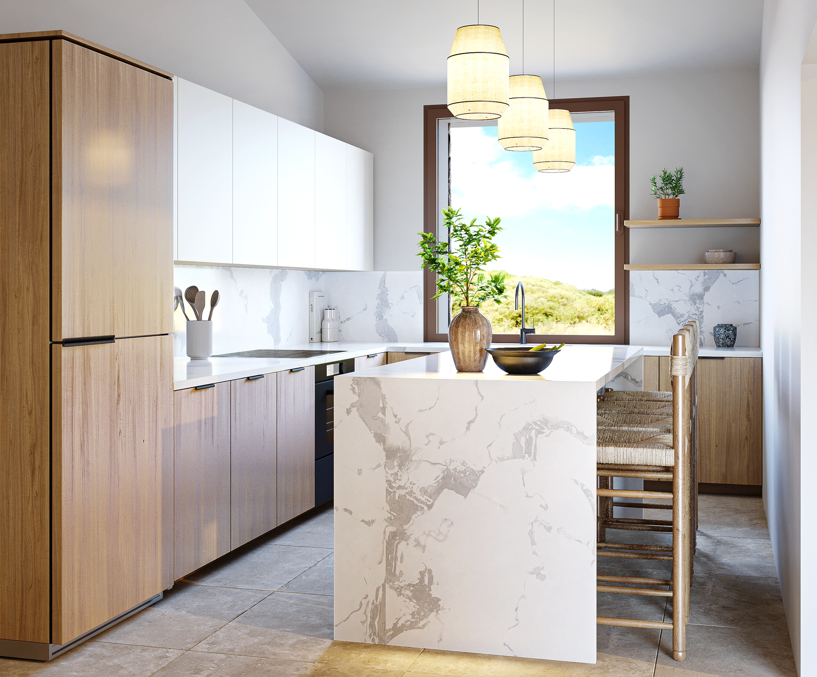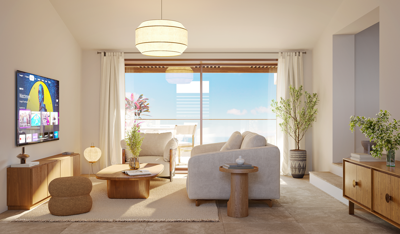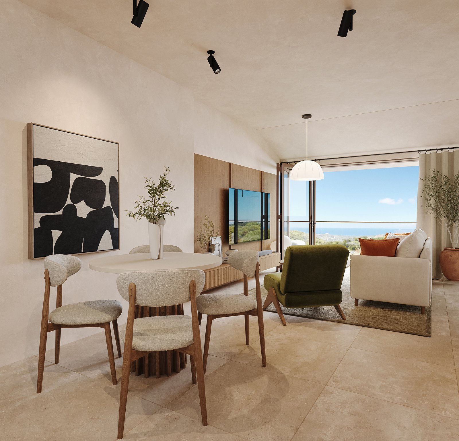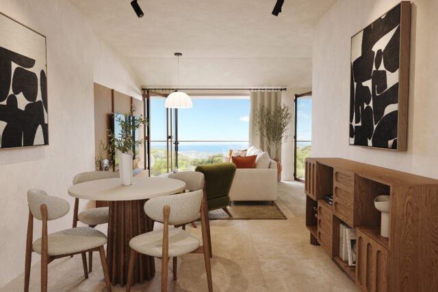 The apartment’s open-plan living area is bright and inviting, with large windows and an abundance of natural light. The contemporary kitchen includes top-of-the-line appliances and a generous countertop, making it ideal for preparing family meals. The dining area comfortably seats six, perfect for gatherings or quiet dinners.
